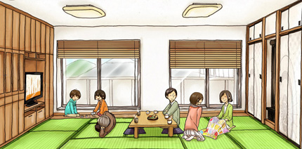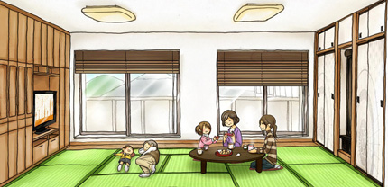 畳は部屋やコーナーを多用途に利用できます。椅子やテーブル式の洋間は、なんとなくその部屋やコーナーの用途を限定してしまいますが、畳なら、あるときは茶の間になり、あるときは寝室になり、あるときは作業場になりと、必要なシーンに応じた使い方ができるんです。