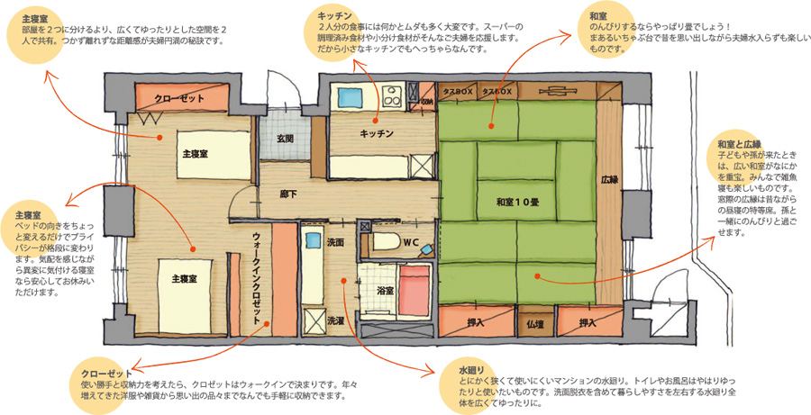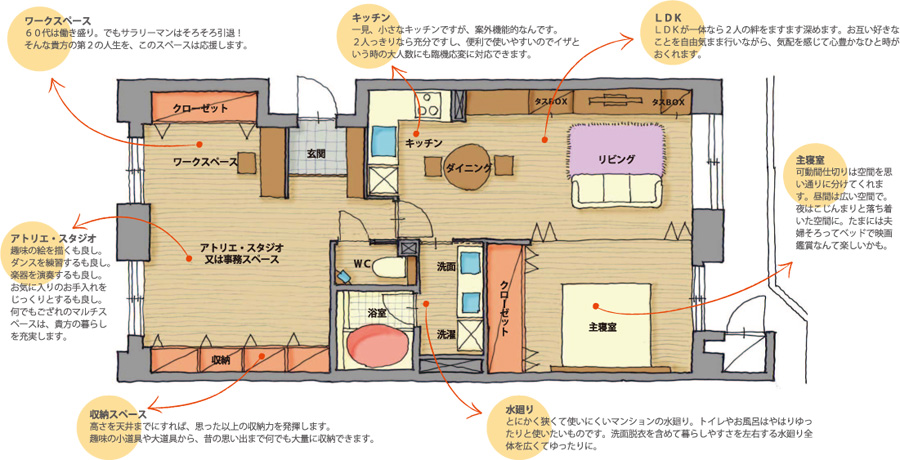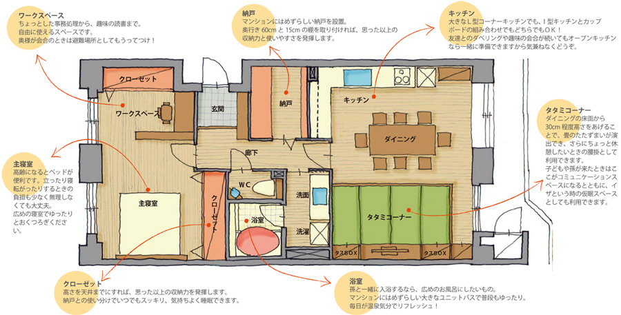 そこで、高齢者にとって暮らしやすいマンションを、団塊世代が豊かに、また幸せに暮らせる住まいにするプランを考えます。
