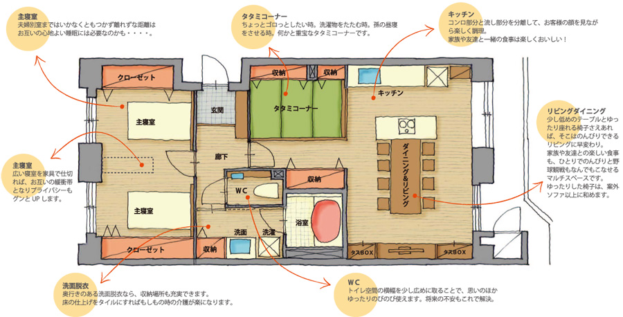 できればトイレや洗面、お風呂といった水廻りは、スペースにゆとりを持たせたプランで考え、将来への対応にも配慮しておくとさらに安心できる住まいになっていきます。 | | |