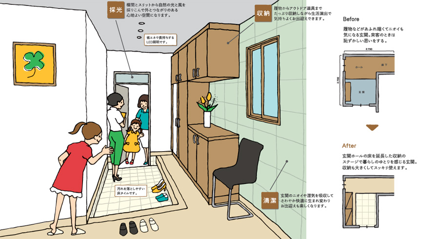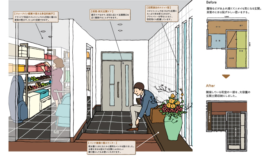 | そこで、例えば上がり框をちょっとひと工夫。上がれるスペースを長くするだけで、大人数の靴も整然と整理できる玄関に生まれ変わります。一緒に玄関収納のボリュームアップも検討すれば、いつでもスッキリで爽やかな玄関に生まれ変わります。 |