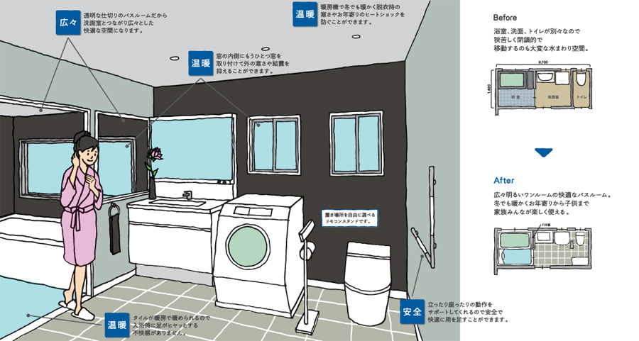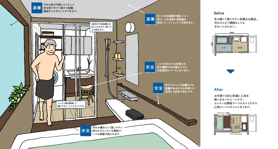 浴室への出入が楽な3枚引き戸にして、開口も広く車椅子でも安心な浴室へのリフォームはいかがでしょう。さらに出入を楽にする段差のないドアと、入浴後の水滴に配慮した脱衣室の床タイルは、風呂上りの作業を手軽にします。 | |
