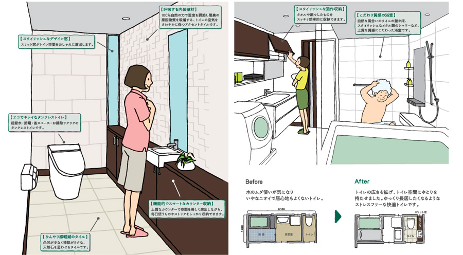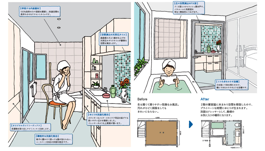 | 入浴は気分もリフレッシュできますし、のんびり満喫したい時間です。一般的な浴室の広さを少しだけ大きくするだけで、ゆったりのんびりと入浴が楽しめます。 |