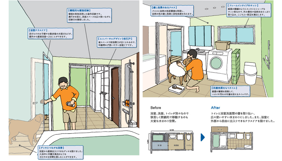 | 浴室を、もっといろいろな用途で使いやすくしたいとお考えの方。例えばペットの散歩や入浴に利用するというプランはいかがでしょうか。浴室の壁の一部に外部へのドアを設置し、そこにデッキを設置するだけで、ペットの散歩や入浴が手軽になります。 |