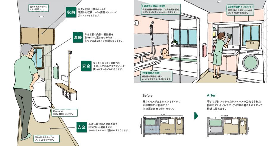 | トイレの隣の洗面脱衣室との壁を少しだけ移動し、トイレ空間にゆとりをもたせることで居心地の良さと掃除のしやすさをグレードアップ。 |