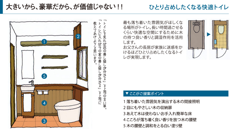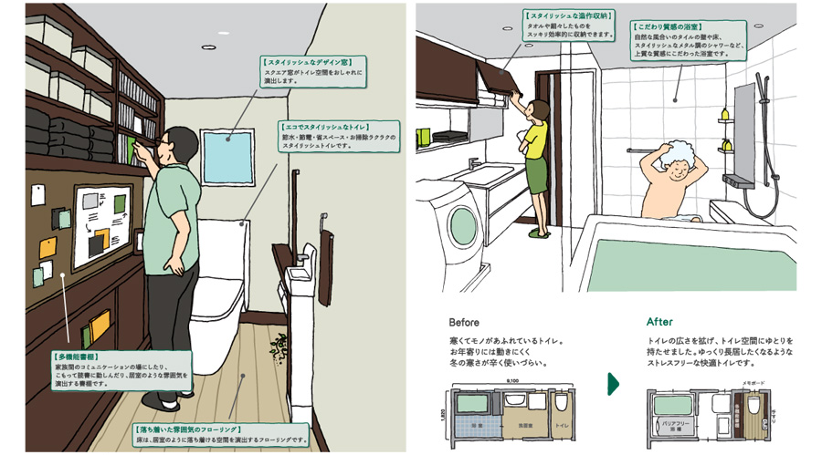 | トイレの隣の洗面脱衣室との壁を少しだけ移動し、トイレ空間にゆとりを持たせることで、ひとつの壁全面が多機能に使えるトイレに進化します。タオルやストックの収納に加え、ちょっとした読み物をおく書棚を設置。さらに家族との情報共有にうってつけのコミュニケーションボードの設置など、壁を移動してできたゆとりを充分に活かしたトイレが出来上がります。 |