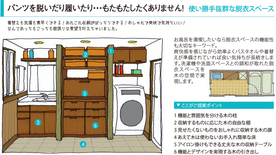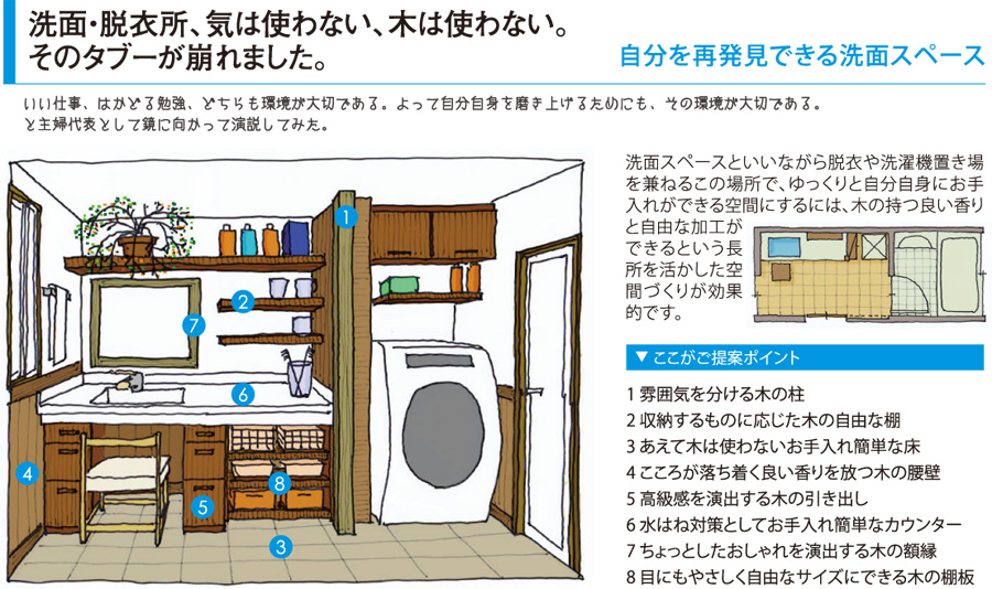 | 脱衣室にある洗濯機を、別の場所に移動し、床を竹の仕上げにすれば、すでにその場所から温泉みたい。まさに毎日が温泉気分に浸れます。 |