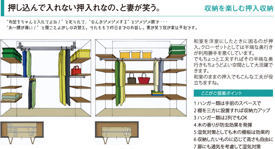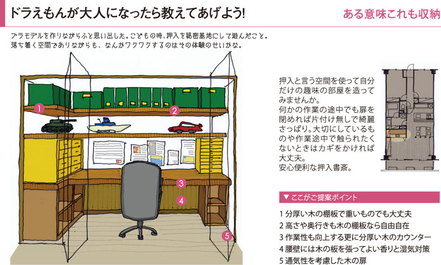 | 玄関の隣の部屋の状況にもよりますが、例え1畳の広さでもあれば大きく変わります。家族の出入をこの収納場所に設置すれば、お客様用玄関はいつでも整然ときれいなままですから、突然の来客でもあわてず騒がず汗かかずで対応可能になります。この小さな納戸を併設すればスッキリきれいがいつでも維持できるタフで万能な多機能玄関に生まれ変わります。 |