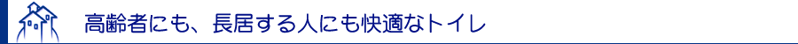 | 立ち座りを楽にする手すりとともに、手をついて立ち上がれるカウンターも設置してありますので、高齢者の方でも安心してご利用いただけます。掃除のしやすい便器、ストック用の収納なども完備していますので、いつでも爽やかでありながら高齢者にも使いやすいトイレです。 |